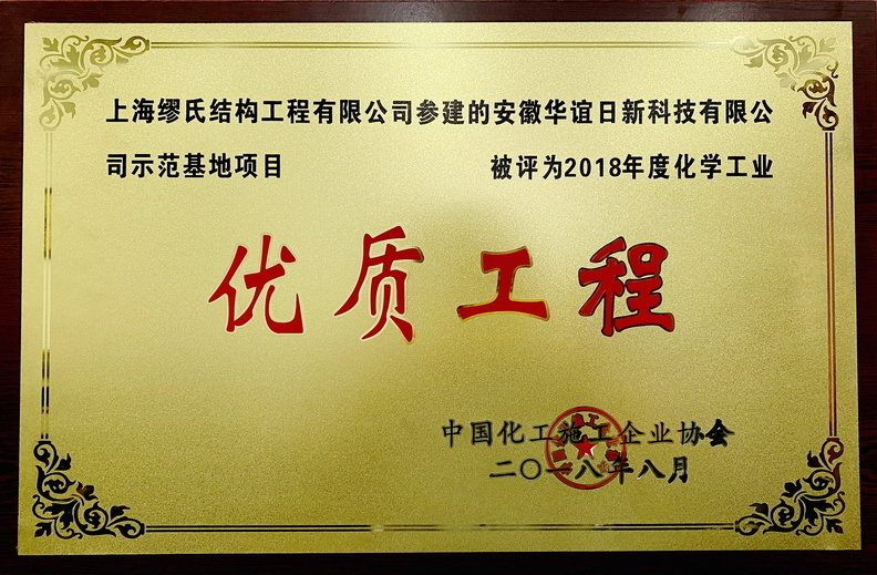 近日,中国化工施工企业协会正式发布2018年度优质工程表彰决定,由上海缪氏结构工程有限公司参建的安徽华谊日新科技有限公司示范基地项目被评为“2018年度化学工业优质工程”。